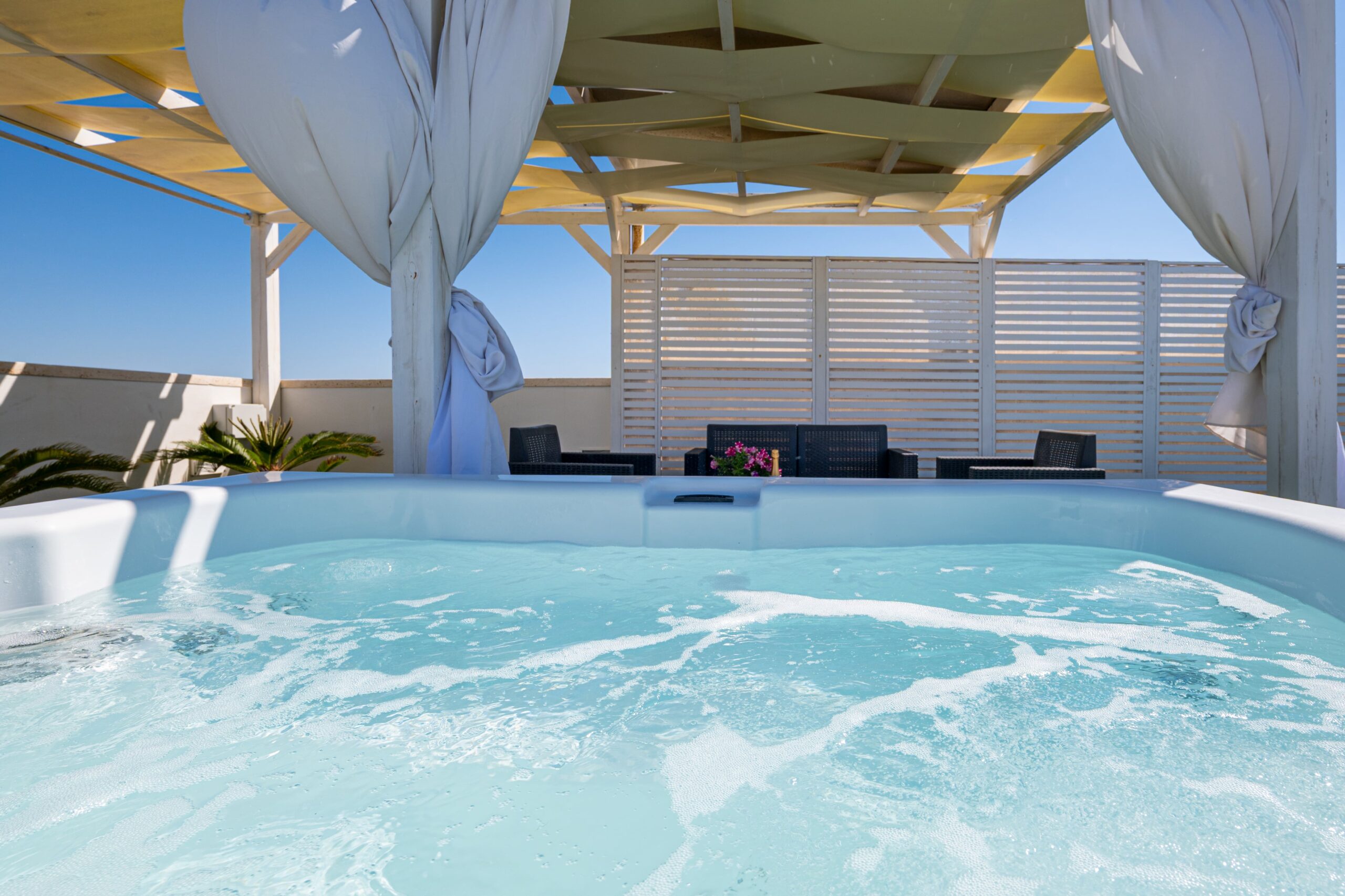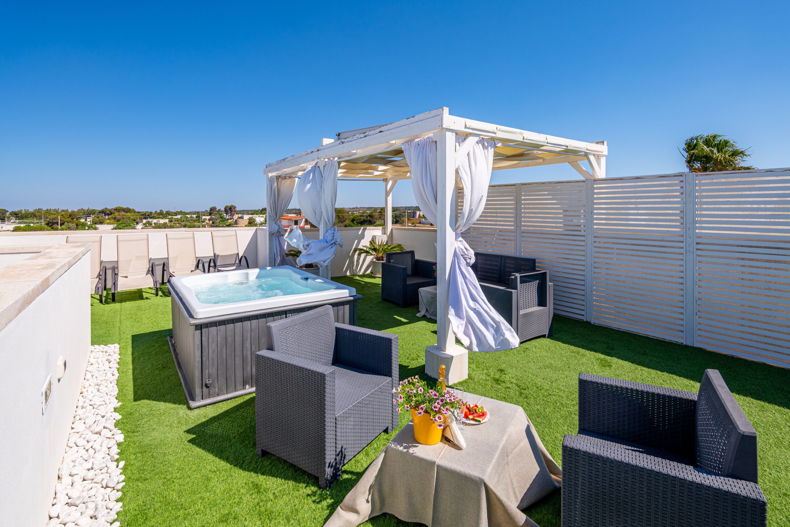 Area Garden equipaggiata con gazebo e idromassaggio per concedervi attimi di relax in struttura, avvolti dal silenzio e dalla vista mare